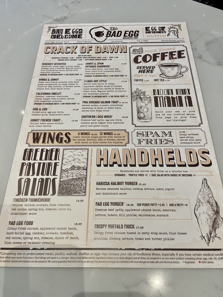 Nestled in the bustling atmosphere of Seattle's Sea-Tac Airport, Bad Egg elevates breakfast and brunch with a delightful menu that stands out amid the casual dining options. With a focus on hearty, comfort food, you can expect dishes like the Wellness Breakfast Biscuit, which combines grilled chicken, scrambled egg whites, mushrooms, and everything spice served alongside breakfast potatoes. It's not just about traditional fare; for those short on time, grab-and-go sushi rolls offer an intriguing option.
